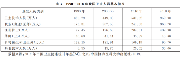 卫生人才队伍。我国卫生人才队伍不断壮大。卫生技术人员从1990年的389.79万人增长至2018年的952.90万人,注册护士从1990年的97.45万人增长至2018年的409.90万人。与之相比较,药师(士)队伍规模变化较小,2018年人数比1990年仅增加6.2万人(表3)。乡村医生和卫生员人数逐年减少,从1990年的123.15万人下降到2018年的90.70万人,这与全科医生队伍不断壮大相关。近年来,我国大力培养全科医生,规模从2015年的18.86万人(每万人口全科医生数1.38人)增长至2018年的30.87万人(每万人口全科医生数2.22人)。
