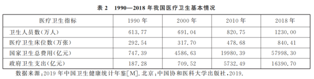 医疗卫生条件。国家医疗卫生条件改善程度显著。卫生人员数从1990年的613.77万人增长至2018年的1230万人,医疗卫生床位数从1990年的292.54万张增长至2018年的840.41万张,2018年国家卫生总费用和政府卫生支出分别是1990年的77.6倍和87.5倍(表2)。