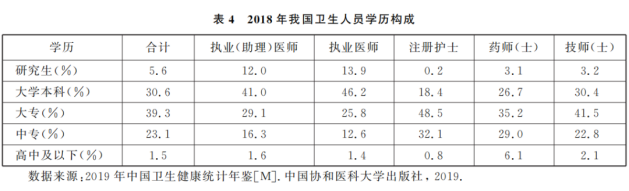 2018年,全国医学专业毕业生超过百万人,然而毕业研究生只有约7万人,医学研究生所占比例较小。从表4可知,我国卫生人员中具有研究生学历的只占5.6%,本科学历的占30.6%,本科以下学历的占63.9%。我国卫生人员队伍质量需要进一步提升,客观上要求大力发展医学研究生教育事业,尤其是以培养高层次医学应用型人才为目标的医学专业学位研究生教育事业。扩大医学专业学位研究生培养规模,提升医学专业学位研究生教育供给能力,是满足人民日益增长的美好生活需要与卫生服务健康需求的着力点。