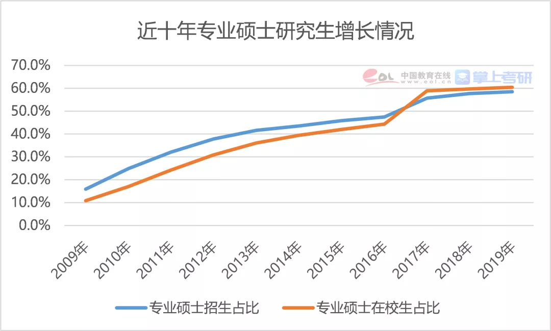 近年来,专业硕士研究生招生规模显著增长。自2017年起,专业硕士招生规模始终高于学术学位硕士。2019年硕士研究生招生81.1万人,专硕招生规模达47.4万人,占比为58.5%。2019年专业硕士研究生在校生147.4万人,占比60.4%。2009-2019年专业硕士研究生增长情况如图: