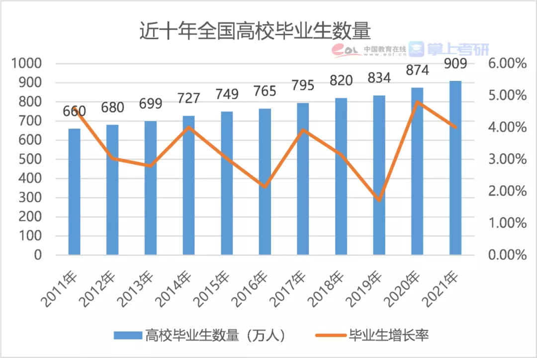 就业压力是导致研究生报名人数暴涨的主要原因之一。2021届高校毕业生规模预计达909万人,同比增加35万人,近十年来高居不下。加上今年新冠疫情的影响,使得就业形势更为严峻。