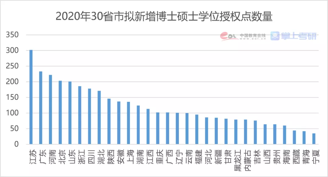 30个省市中,江苏省拟新增博士硕士学位授权点最多,达到302个,其次是广东省,拟新增博士硕士学位点233个。