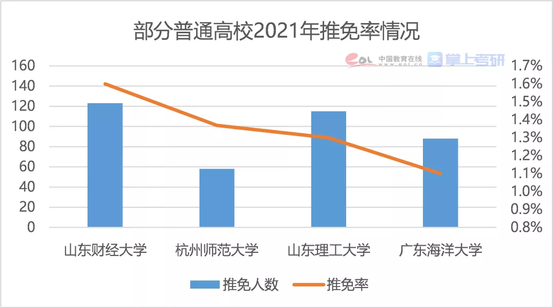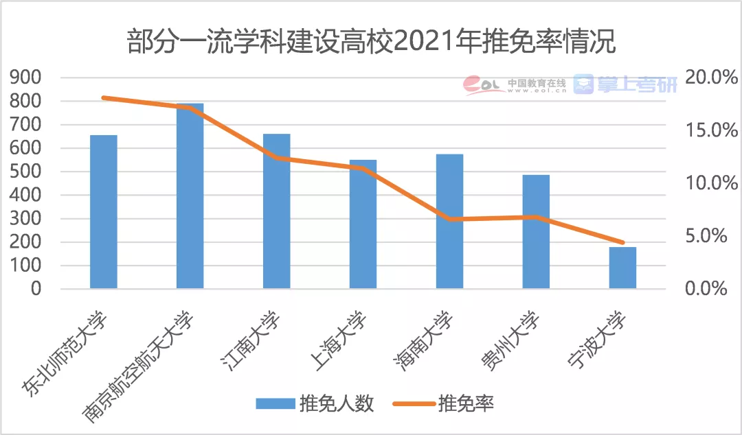 而一流学科建设高校推免率差异更大。东北师范大学推免率为18.1%,上海大学推免率为11.4%,海南大学推免率为6.6%,宁波大学仅为4.4%。