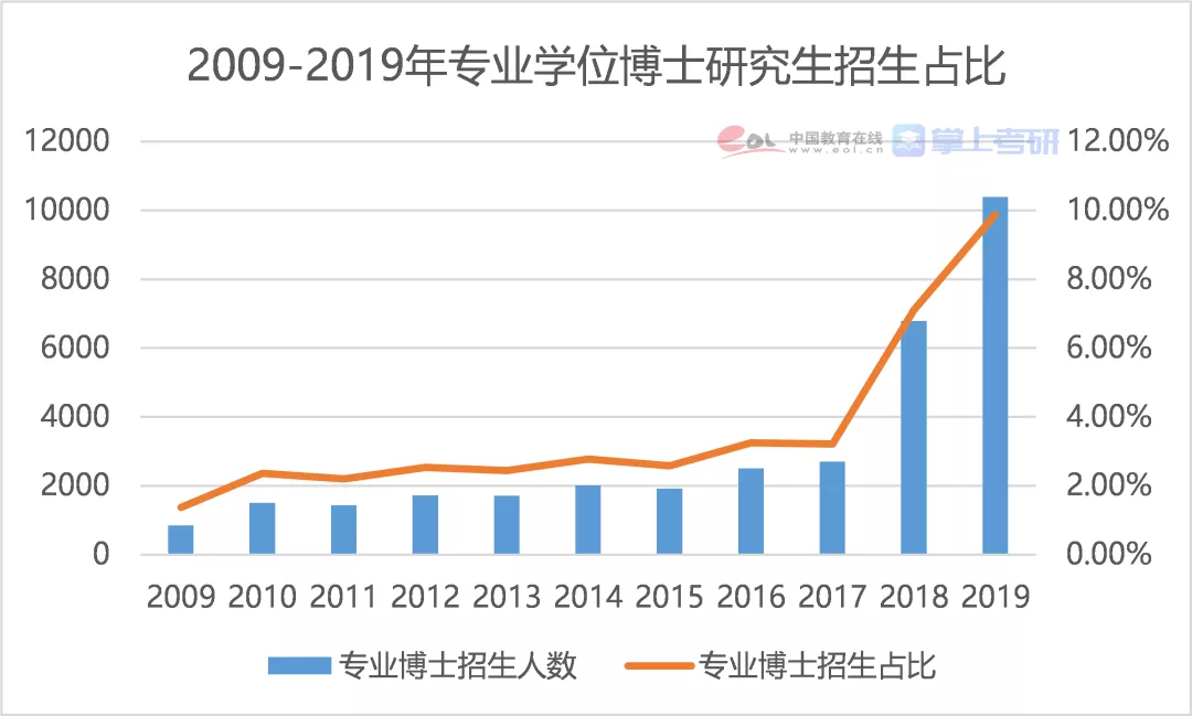 2020年9月30日,国务院学位委员会、教育部印发《专业学位研究生教育发展方案(2020—2025)》。方案提出,专业学位研究生教育发展目标是,到2025年,以国家重大战略、关键领域和社会重大需求为重点,增设一批硕士、博士专业学位类别,大幅增加博士专业学位研究生招生数量,进一步创新专业学位研究生培养模式。方案要求,加快发展博士专业学位研究生教育,要扩大博士专业学位研究生教育规模;在确保质量的基础上,以临床医学博士专业学位、工程类博士专业学位、教育博士专业学位为重点,增设一批博士专业学位授权点,快速提升培养能力;博士研究生招生计划向专业学位倾斜,每年常规增量专门安排一定比例用于博士专业学位发展。