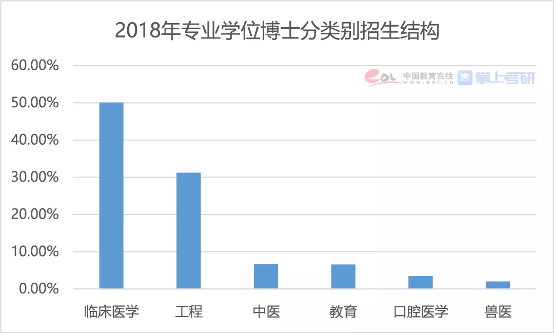 专业学位博士研究生的招生类别为教育、工程、兽医、临床医学、口腔医学、中医,共计6个。在2018年专业学位博士研究生招生规模中,临床医学占比最高,为50.1%,工程占比第二,为31.2%。
