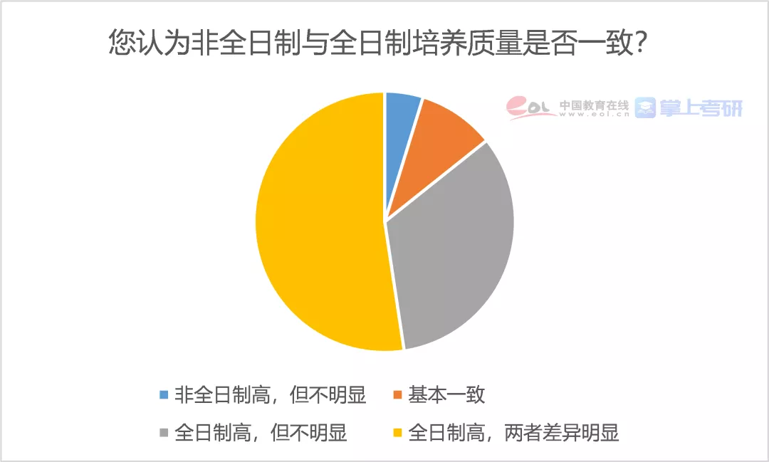 在面向招生单位的调查中显示,52%的招生单位认为全日制的培养质量比非全日制更高,两者差异明显,33%认为全日制的培养质量比非全日制高,但不明显,10%认为非全日制培养质量与全日制基本一致,5%认为非全日制培养质量比全日制高,但不明显。也就是说有近半数招生单位认为全日制与非全日制研究生质量基本一致,即使有差异,也不明显。