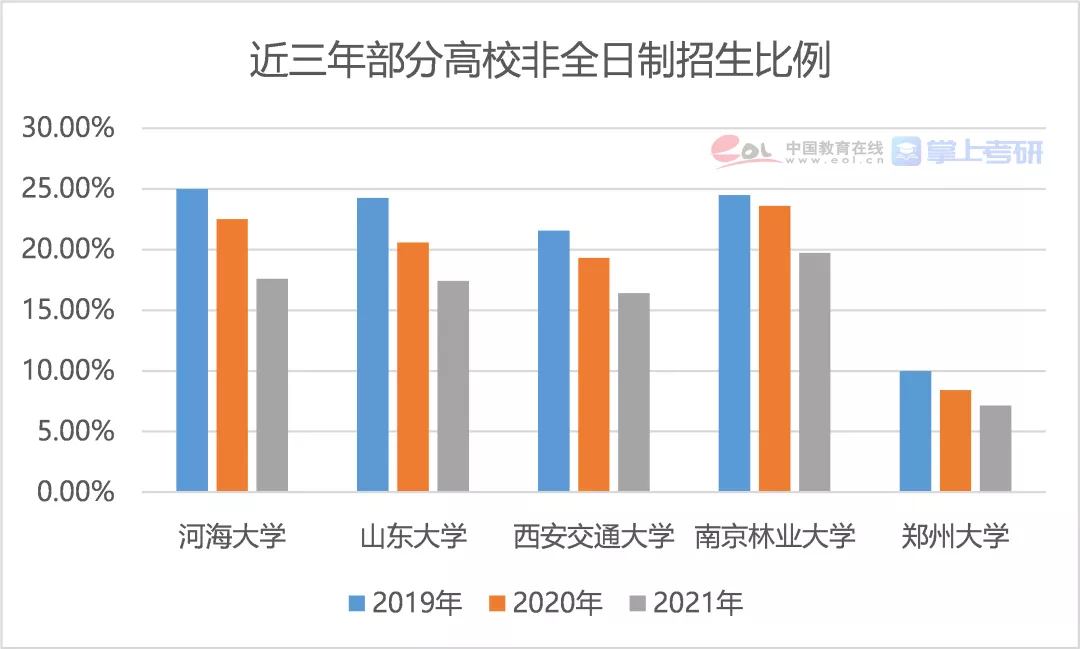 河海大学2019年计划招收非全日制硕士研究生1000人,占总招生计划的25%,到2021年计划招收非全日制硕士研究生800人,占总招生计划的17.6%,较2019年减少了7.4%。山东大学、西安交通大学、南京林业大学、郑州大学的非全日制硕士研究生招生比例也不断降低。