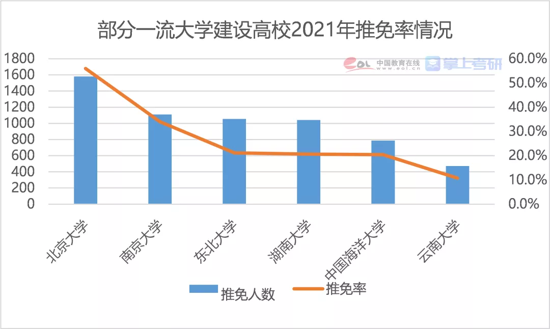 根据对各大高校推免率的统计,北京大学(校本部)推免率最高,达到56%,南京大学推免率为34%,湖南大学推免率为20.6%,云南大学推免率为10.7%。即使是一流大学建设高校,推免率也有明显差异。