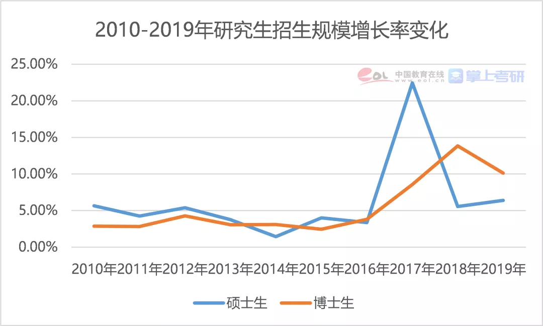 直至2017年,博士招生规模再次进入快速发展阶段,2018年博士招生人数为95502人,较2017年增幅13.9%,2019年博士招生人数达到105169人,增幅为10.1%。