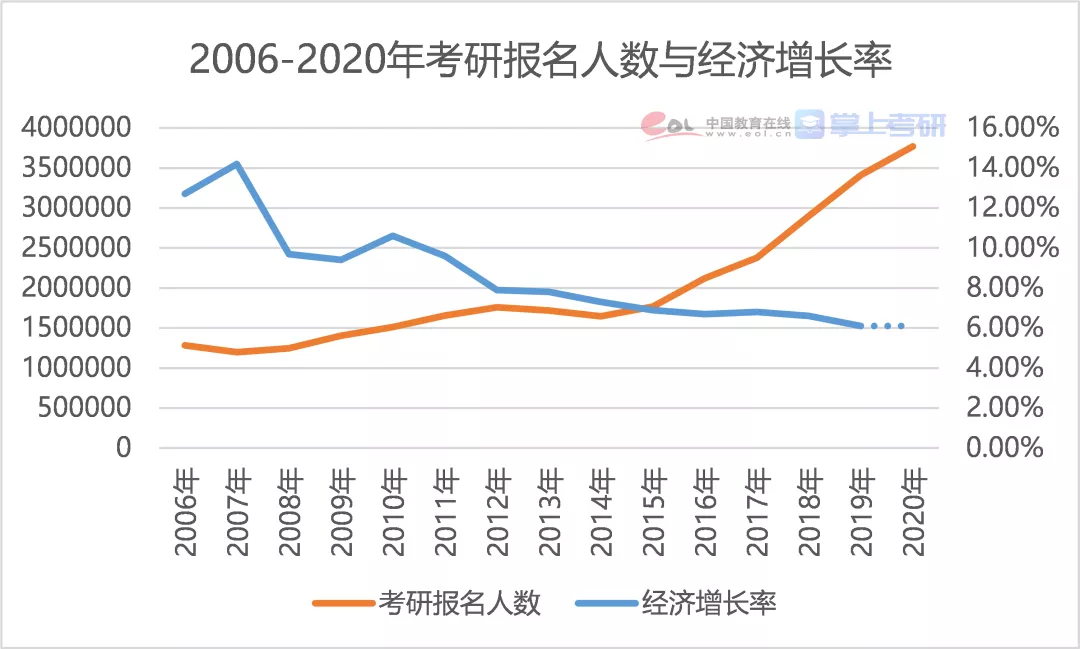 研究生报名人数与经济发展趋势紧密相关,据统计,当我国GDP增速放缓时,研究生报名人数增长率会提高,两者呈现负相关。十一五(2006-2010年)期间,我国GDP快速增长,与此同时,研究生报名人数增长率呈下降趋势,并在2007年降至最低;十三五(2016-2020年)期间,我国经济由高速增长转向高质量低增长率发展阶段,2015年后,研究生报名人数增长率快速上升。