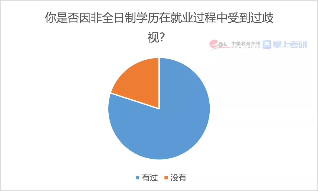 根据中国教育在线调查显示,超过八成的非全日制研究生都因为学历在就业过程中受到过歧视。