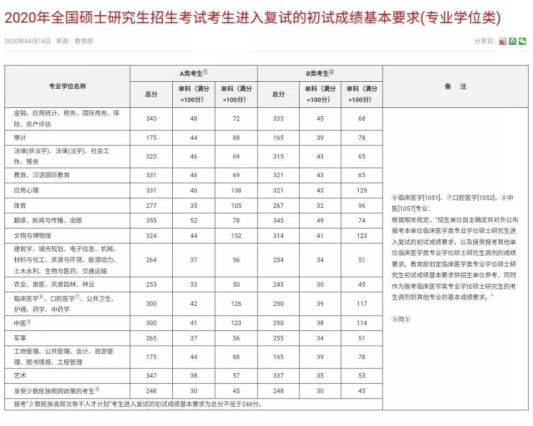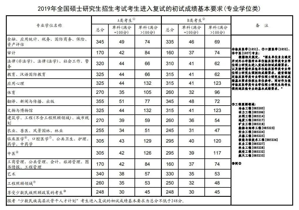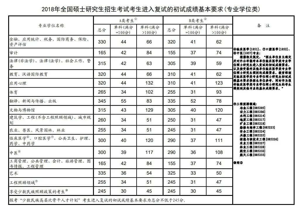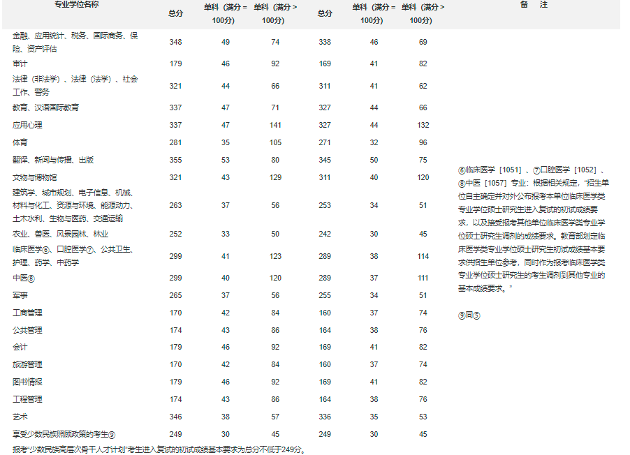 全国硕士研究生招生考试考生进入复试的初试成绩基本要求(专业学位类)(2017-2021年)