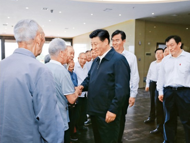 2019年5月20日至22日,中共中央总书记、国家主席、中央军委主席习近平在江西考察,主持召开推动中部地区崛起工作座谈会并发表重要讲话。这是习近平在赣州市于都县中央红军长征出发纪念馆会见于都县的红军后代、革命烈士家属代表。 新华社记者 鞠鹏/摄