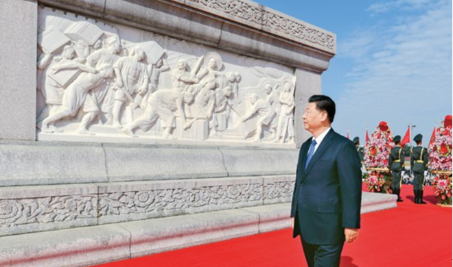 2020年9月30日上午,党和国家领导人习近平、李克强、栗战书、汪洋、王沪宁、赵乐际、韩正、王岐山等来到北京天安门广场,出席烈士纪念日向人民英雄敬献花篮仪式。这是习近平瞻仰人民英雄纪念碑。 新华社记者 岳月伟/摄