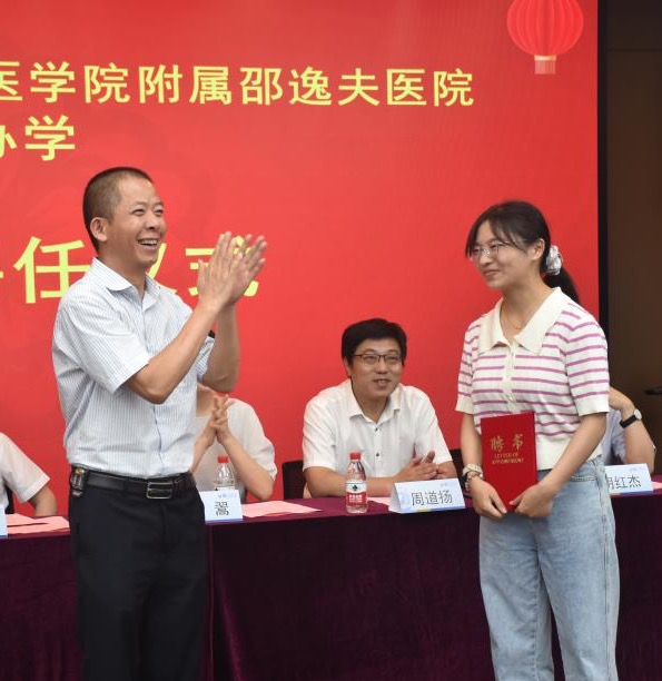 学院与邵逸夫医院签署教学医院合作协议。学院党委副书记林国旗宣读了聘任唐梦晓老师为医学影像学专业201班班主任的聘任文件,学院党委书记吴剑平为唐梦晓老师颁发聘书。