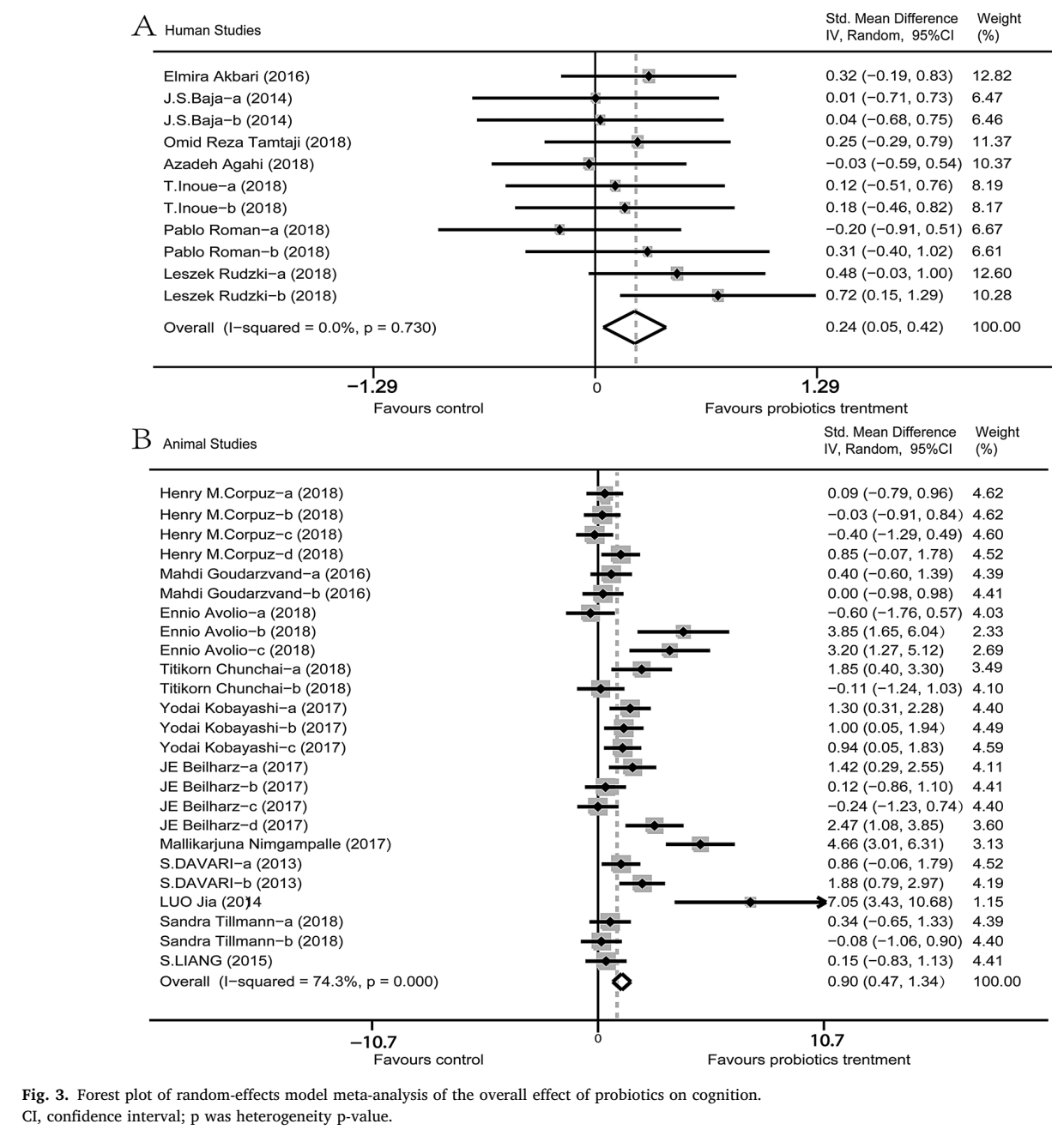 根据PICOS标准,我们对纳入的7项随机临床研究和11项动物实验研究进行定量分析,发现益生菌对认知障碍患者和动物都有明显改善作用;