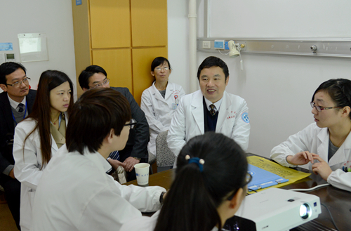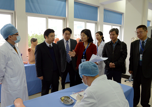 随后,马建辉教授、付瑶博士实地走访考察了临床教学培训基地、教研室与病区。在教学培训基地,专家逐一走访临床教研室、虚拟教学训练实验室、腹部触诊训练室、临床模拟技能实验室等,向负责教学的医师了解临床教学授课情况,与临床医学专业学生交流学习情况,观摩学生临床技能操作。在内外科的教研室和病区,专家进行了教学查房,详细查阅了病史资料,开展病例讨论,观摩学生基本操作等。