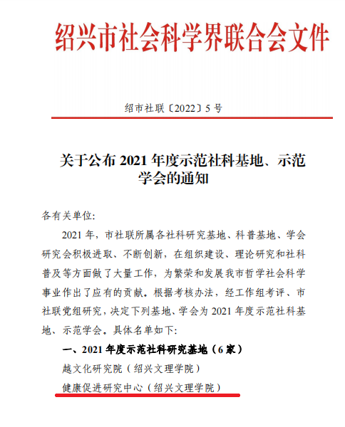 日前,经过绍兴市社科联的严格评审,开云最新官方健康促进研究中心获批为绍兴市2021 年度示范社科基地。