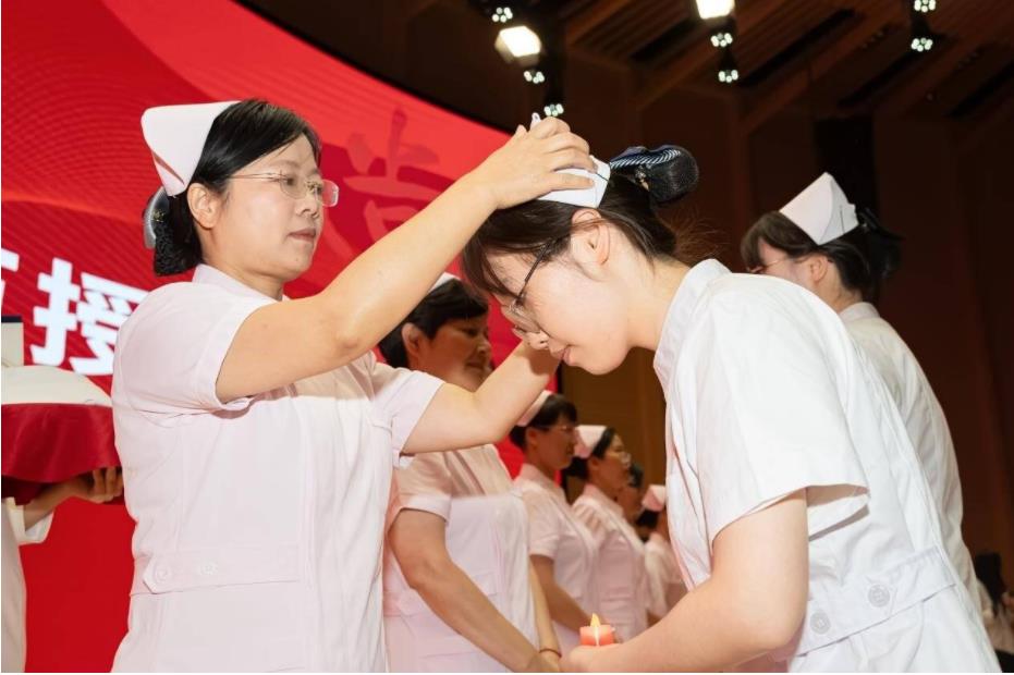 授帽仪式的核心环节庄重而神圣。绍兴文理学院附属医院 2024 年十佳员工、护士长邢冬和陶晓红老师缓步走到学生们面前,她们手中高举着象征着南丁格尔精神的红色蜡烛,她们将这神圣的火焰依次传给学生们,点亮了现场所有护生手中的蜡烛。烛光在学子们手中传递,也在他们心中蔓延,照亮了他们未来的护理之路。