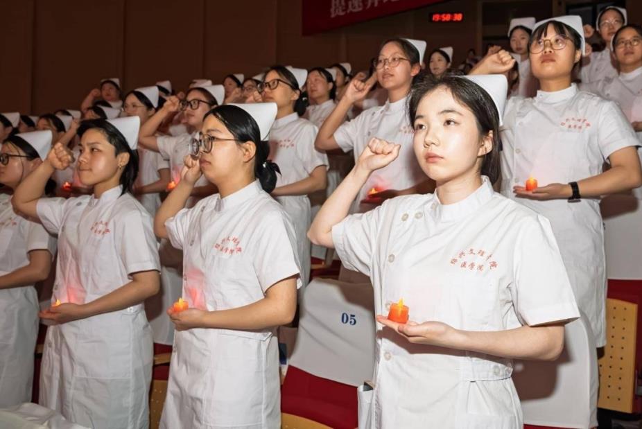 紧接着,十位护理前辈走到学生代表面前,为她们授帽。洁白的护士帽轻轻落在学子们的头上,如同一份沉甸甸的责任,落在了学子们的肩上,也落在了她们的心中。在优秀校友徐华丽女士的领誓下,全体护生庄严宣誓。她们高举右拳,声音洪亮而坚定,表达了献身护理事业的无悔决心,奉行革命的人道主义精神,坚守救死扶伤的信念,履行“保存生命、减轻痛苦、促进健康”的神圣职责。这誓言在报告厅内回荡,激励着每一位护生在未来的职业道路上勇往直前,无惧风雨,用青春与热血书写护理事业的辉煌篇章。