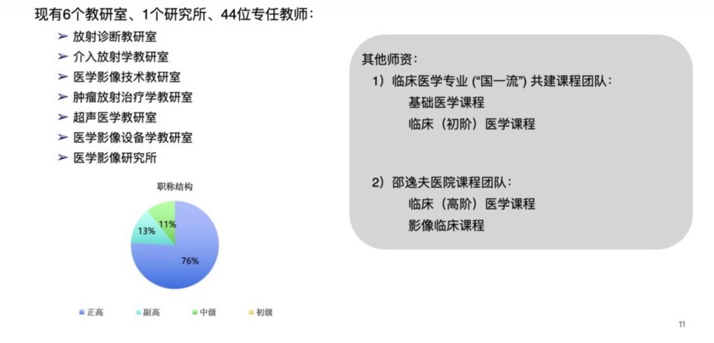 医学影像学专任教师根据课程模块分为三组。医学影像学模块现有6个教研室1个校级医学研究所,专任教师44名,其中正高职称教师占比76%、副高职称教师占比13%、中级职称教师占比11%;开云最新官方内教师(基础医学课程和初阶临床课程模块)教师23名,其中正高职称教师占比35%、副高职称教师占比17%、中级职称占比48%;浙江大学开云最新官方附属邵逸夫医院课程团队专任教师99人(不含临床见习带教老师),正高职称教师占比34%、副高职称教师占比57%、中级职称教师占比9%。临床主干课程的授课教师多数来自临床一线的“双师型”教师。