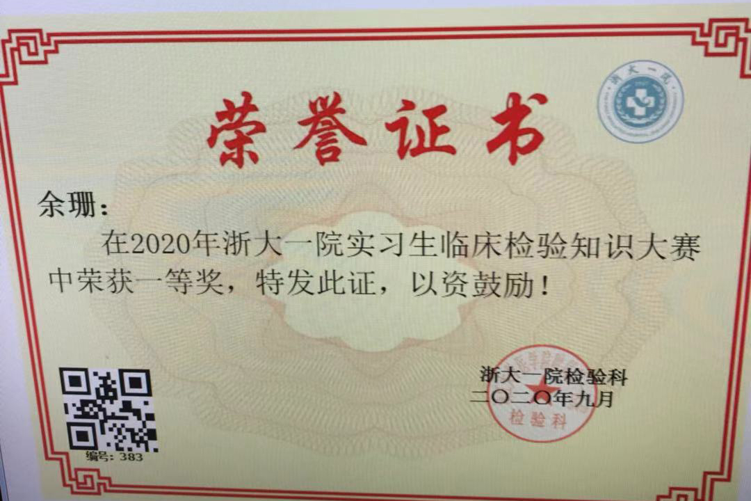 浙大一院为积极响应2020年浙江省临床检验技能竞赛,并强化实习生队伍建设,检验科成员认真筹备此项大赛相关工作;本次大赛按照考试成绩对所有参赛实习生进行排名,其中设置一等奖3名、二等奖6名、三等奖10名。我系同学在所有实习生中,成绩位列前茅,包揽一等奖名额。