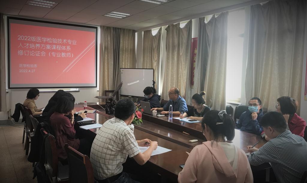 2022年4月27日中午,我系召开2022版医学检验技术专业人才培养方案修订专业教师论证会,会议由医学检验系主任张建华教授主持,医学检验系、基础医学部及护理系相关课程负责人参加。会议首先介绍了培养方案修订工作进展,包括通过各相关利益方的问卷调查、座谈会、单独访谈等形式收集现行培养方案的合理性、存在问题与改进措施,形成评价报告,在此基础上,初步形成2022版培养方案,包括培养目标、毕业要求与课程体系。重点介绍了新版培养方案的特色,以及课程体系的调整情况。与会教师就课程开设时间、学分、先后修关系等方面分别提出意见或建议。会议最后,要求各专业教师及时启动课程教学大纲的调研修订工作。