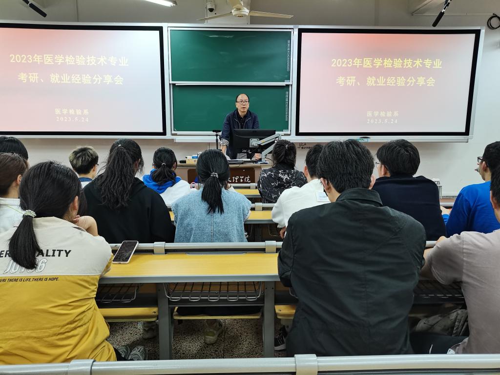 为加强系部学风建设,增强学生生涯发展规划的合理性、树立职场信心,进一步帮助学生明确考研目标、提高考研热情,充分发挥朋辈榜样赋能作用,5月24日,医学检验系开展考研、就业经验分享会”,充分发挥“追光”榜样,致用致远作用。检验系2020级全体学生以及2021和2022级部分学生参加,医学检验系副主任刘晓瑜主持,医学检验系主任张建华参加了会议。