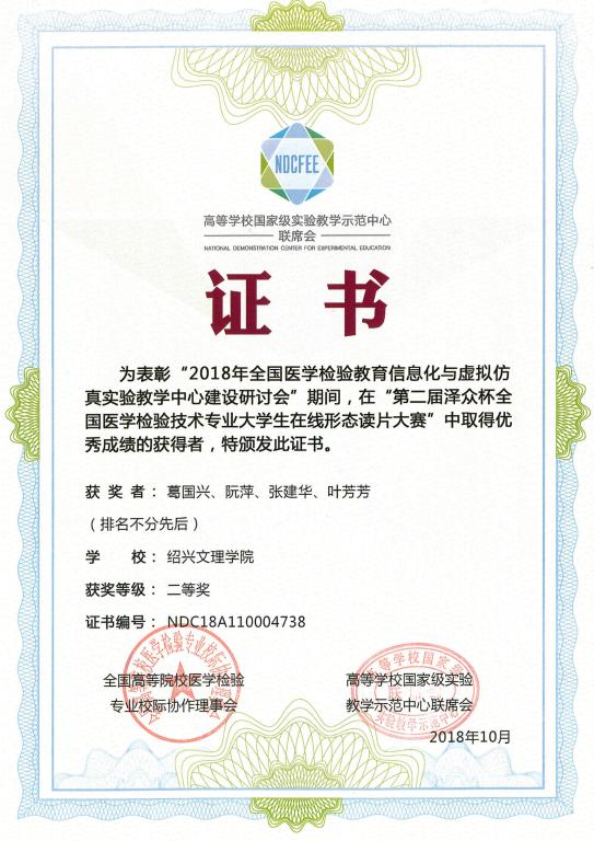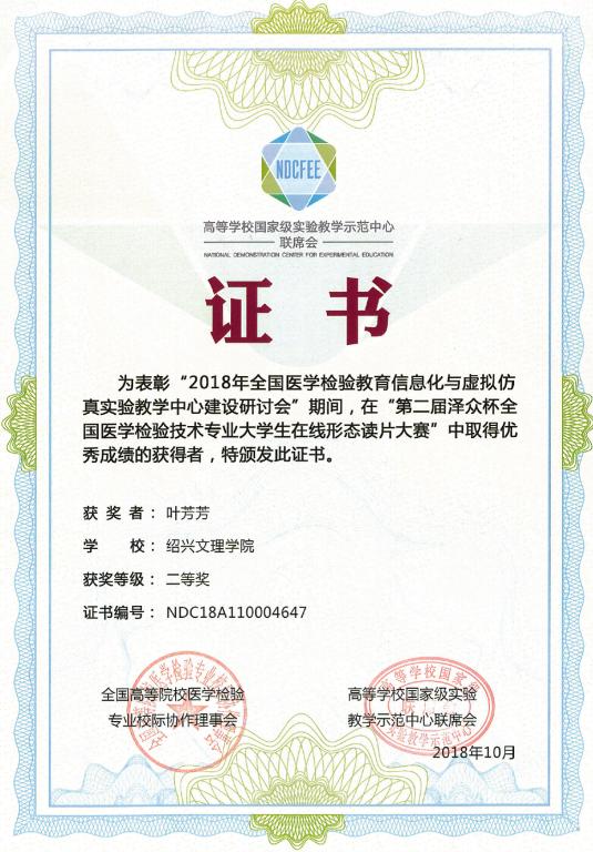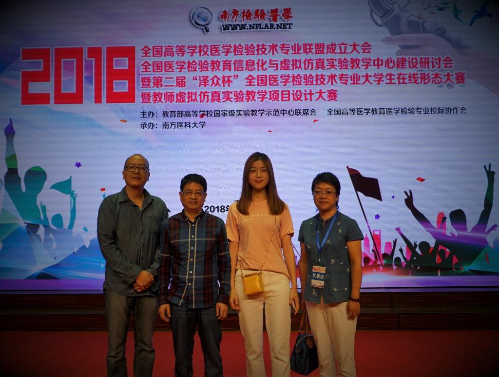 2018年10月11日至13日,由高等学校国家级实验教学示范中心联席会、全国高等医学教育医学检验专业校际协作会主办,南方医科大学承办的医学检验教育信息化与虚拟仿真中心建设研讨会在广州召开,会议期间,举办了第二届“泽众杯”全国医学检验技术专业大学生在线形态大赛,我系医学检验技术专业16级叶芳芳同学获得本科组个人二等奖,并获得参赛团队二等奖。