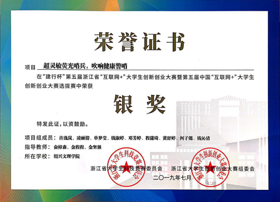 我院许逸岚、凌丽倩、单梦莹等九位同学《超灵敏荧光哨兵,吹响健康警哨》项目在“建行杯”第五届浙江省“互联网+”大学生创新创业大赛暨第五届中国“互联网+”大学生创新创业大赛荣获银奖。