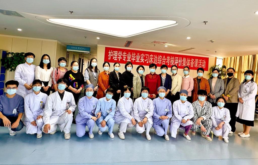 本次集体备课活动由汇报、考核观摩、研讨三部分组成。首先,附属第二医院大内科护士长陈芬娟老师以“基于OSCE考核模式为导向的护生临床能力规范化培训”为题介绍了针对毕业实习学生OSCE综合能力考核的方案设计、实施过程,以及连续4年开展OSCE考核的经验分享。随后,与会老师进入OSCE站点观摩考核过程,考核学生为19级护理学实习生,分为4个站点,模拟病人(SP)由经过培训的实习学生担任。观摩结束后,院、校教师从不同的角度对OSCE考核的临床案例设计、站点设置、SP培训、考核评价标准、课程思政元素融入、护生职业素养的养成等问题展开了研讨。