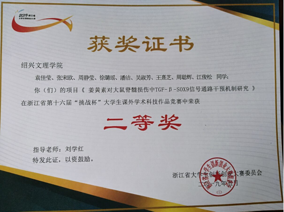 开云最新官方袁佳莹、宋欧等9名同学的项目《姜黄素对大鼠脊髓损伤中TGF-β-SOX9信号通路干预机制研究》在浙江省第十六届“挑战杯”大学生课外学术科技作品竞赛中荣获二等奖。该项目由医学实验中心主任刘学红指导。