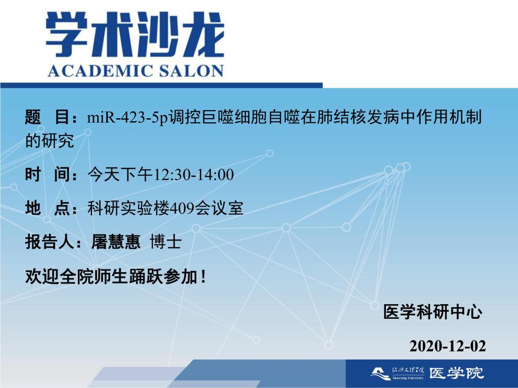 【学术沙龙】miR-423-5p调控巨噬细胞自噬在肺结核发病中作用机制的研究