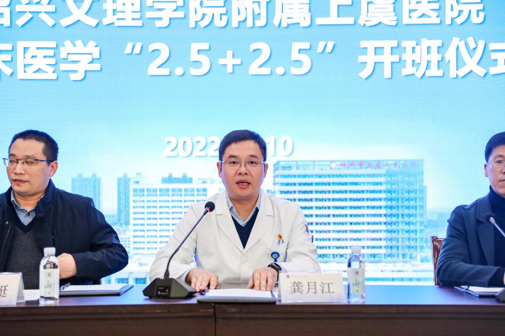 龚月江在开班仪式上致辞,感谢我院对校附属上虞医院的信任与支持,表示“2.5+2.5”校院一体化学生培养必将为医院的发展增添无限生机和活力。就做好2.5教学工作,他对医院职能科室和教研室提出了四点希望和要求:一是加强责任意识,勇于承担社会责任。既要给学生战胜困难的勇气和智慧,也要帮助学生不断修正前进的方向;二是言传身教、为人师表,以身作则、率先垂范,用正确的人生观、价值观、敬业精神以及学术品格,用自己的人格力量去感召学生;三是治学严谨,勤学进取,及时更新知识,不断提高教学和科研水平与能力,定期交流总结改进教学方法与教学技巧;四是热爱学生,做学生的良师益友,在教学中,要以平等的态度对待学生,尊重和充分信任学生,去深入了解关心他们的每一次进步和成长。