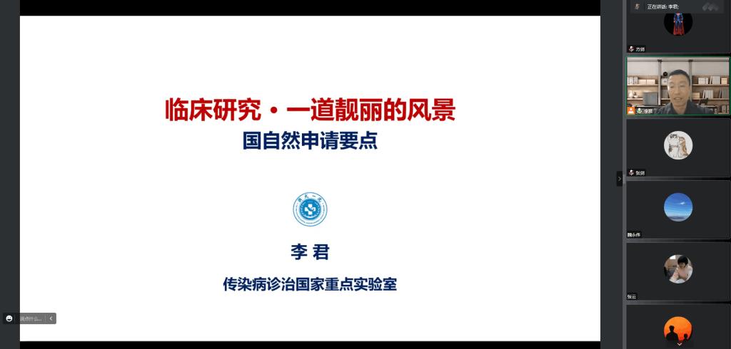 为扎实推进学院2023年国家自然科学基金项目申报工作,高基金申报质量1130晚上,学院举行《临床研究·一道靓丽的风景:国自然申请要点》线上辅导会议,邀请校“鉴湖学者”讲座教授、浙江大学“求是特聘”教授、博士生导师、浙江大学传染病诊治国家重点实验室副主任、国家“万人计划”科技创新领军人才、科技部重点领域创新团队负责人李君教授做辅导报告会议由副院长张剑主持,2023年预申报国家基金的全体教师参加讲座