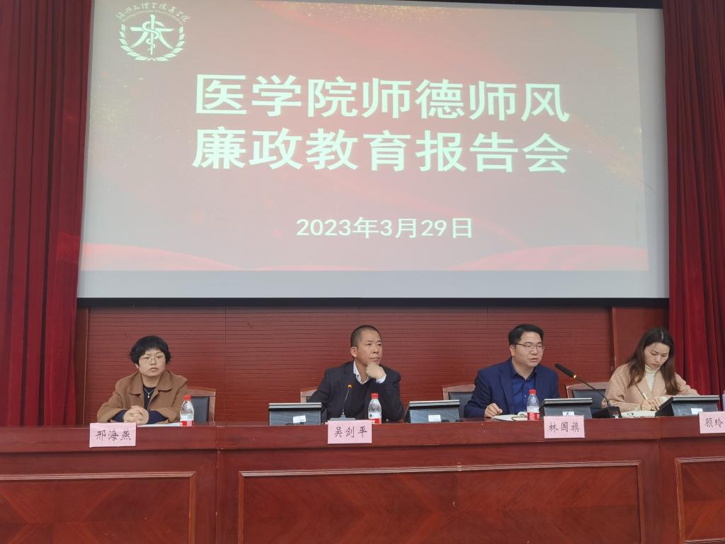 为推进学院师德师风和医德医风建设,打造高素质教师队伍,着力营造风清气正的育人环境。3月29日,学院召开师德师风廉政教育会。院党委书记吴剑平、纪委书记林国旗、副院长邢海燕出席本次会议,各支部书记、全体班主任和辅导员参会。会议由纪委委员顾玲玲主持。