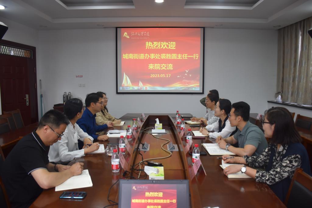 林国旗对裘胜圆主任一行的到来表示欢迎,对城南街道一直以来支持学院的工作表示感谢,并简要介绍了学院的基本情况。林国旗表示,学校和学院高度重视校地合作共建工作,作为属地学院,与属地街道办事处加强沟通和交流,是加强校地融合,提升双方发展高质量发展的重要机制,希望双方能够发挥各自优势,实现资源互补,推进合作共赢。