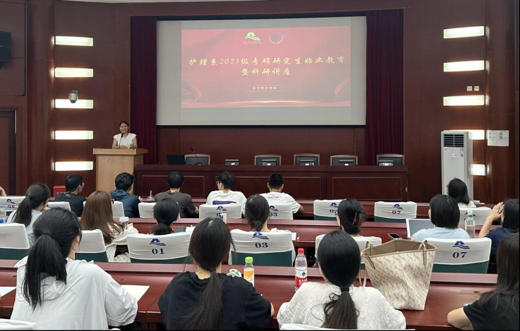 9月19日,护理系在南山校区7号报告厅举行2023级护理专硕研究生始业教育暨科研讲座。本次会议分为四个阶段,分别邀请了2018届校友杨紫燕进行研究生学习经验分享;孙一勤主任对研究生培养方案进行解读;哈尔滨医科大学杰出教授周郁秋从导师视角指导学生三年学习规划,并做了国自然申报的科研讲座。前两个阶段由护理系徐水琴主持,后两个阶段由护理系主任孙一勤主持。2023级护理专硕研究生、2023级护理本科生、护理专硕导师及护理系教师分阶段参加了会议。