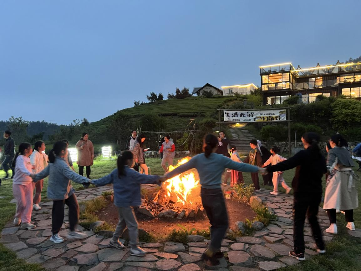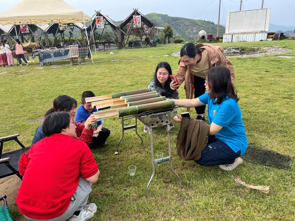团建活动中,老师和家属们大家一起用翠绿的新竹,砍下一节竹筒,装进混合了的米和水,放在炭火中烤制,烤熟的米饭被竹膜所包,香软可口,有竹之清香和米饭之芬芳。大家还在一起制作青团、烧烤,采茶、挖笋。在互助协作中放松了心情,也促进了彼此间的情感。