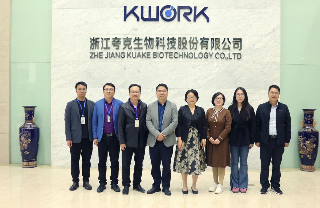 在浙江夸克生物科技有限公司常务副总经理陈青松的带领下,林国旗一行参观公司实验室,深入了解公司发展历程和业务范围。