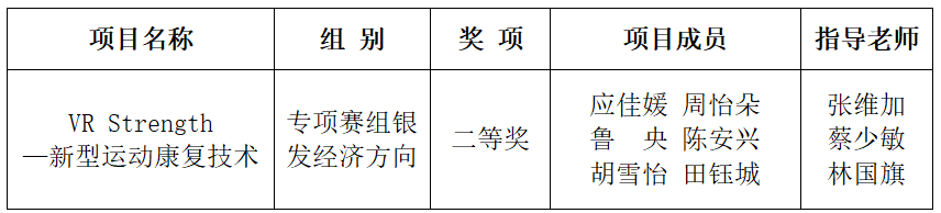 6月5日,由绍兴市人力资源和社会保障局、教育局、科技局等7个部门联合主办的第六届“中国创翼”创业创新大赛绍兴市选拔赛暨第十五届绍兴市大学生创业创新大赛在浙江工业职业技术学院落下帷幕。经过激烈角逐,我院《VR Strength—新型运动康复技术》项目获得大赛专项赛组二等奖。