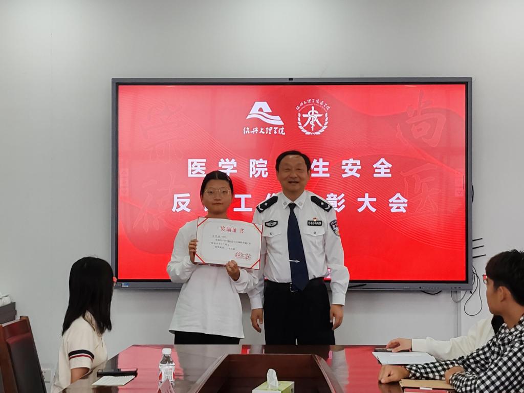公安局驻校警务站专员张文生向马悦恬同学颁发“防诈小卫士”荣誉证书,并作总结点评。他充分肯定了我院在防范电信网络诈骗方面取得的工作成效,并以生动的案例向大家介绍了防范电信网络诈骗的方法及注意事项。