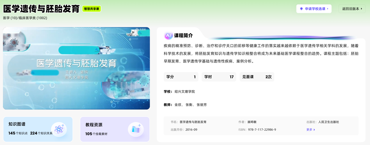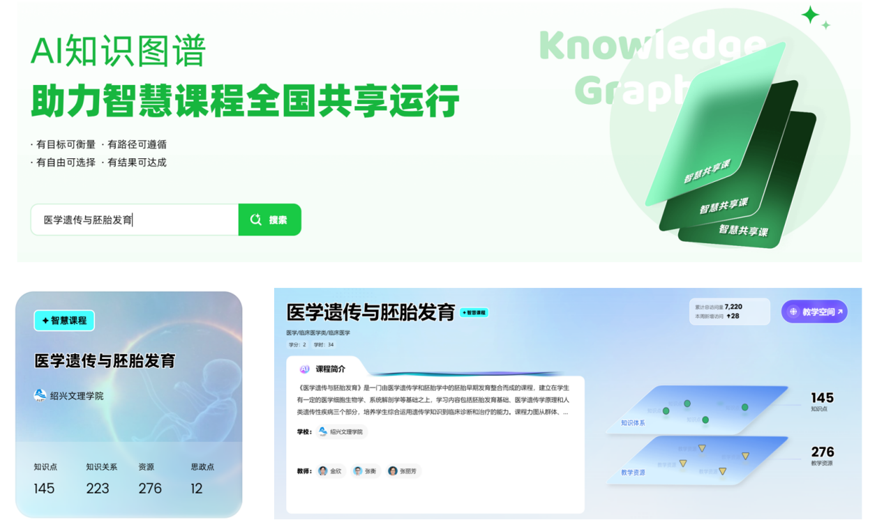 为深入实施教育数字化战略行动,推进人工智能技术与教育教学深度融合,以高标准、高质量构建智能课程体系,探索基于知识图谱与AI的智慧课程建设,实现优质教学资源整合与共享,进一步提升教学质量与资源配置,绍兴文理学院11门AI智慧课程已在智慧树平台上线。其中我院的《医学遗传与胚胎发育》AI智慧课程已于12月24日正式在全国共享运行!目前累积已有全国31所高校2000余名学生学习。