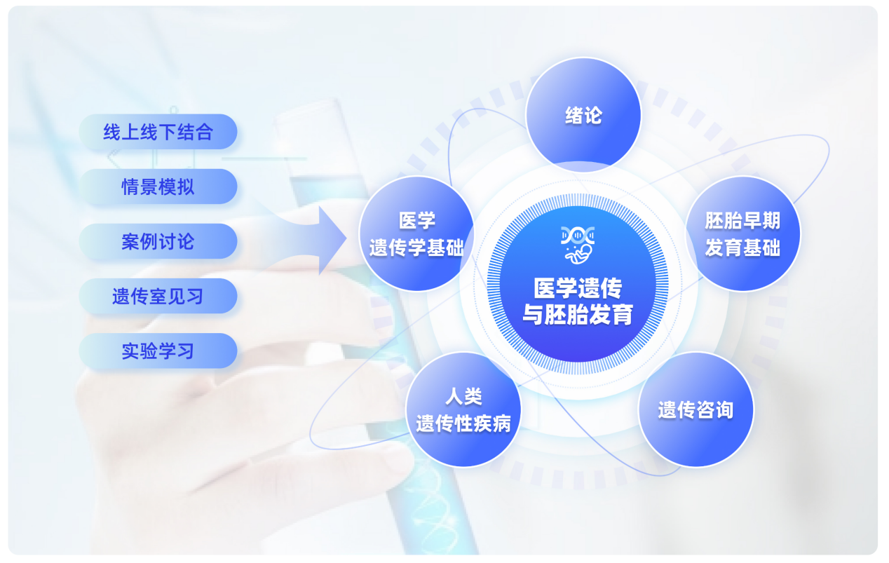 《医学遗传与胚胎发育》是一门由医学遗传学和胚胎学中的胚胎早期发育整合而成的课程,建立在学生有一定的医学细胞生物学、系统解剖学等基础之上,学习内容包括胚胎发育基础、医学遗传学原理和人类遗传性疾病三个部分,培养学生综合运用遗传学知识到临床诊断和治疗的能力。课程力图从群体、个体、细胞和分子水平阐释人类遗传性疾病的遗传规律、分子基础和发病机制,强调遗传物质的传递、胚胎发育和遗传性疾病的发生之间的联系,凸显遗传学在现代医学中的作用,为疾病的分子诊疗与精准预防提供理论依据。