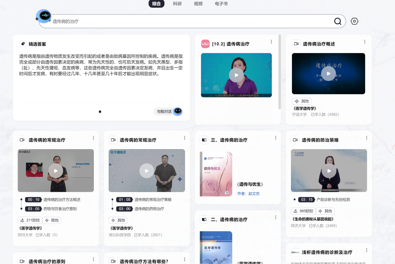 3、AI技术融入教学全过程,支撑课程教学全场景:人工智能技术与教育教学深度融合,AI资源发现根据搜索的知识点智能推荐优质资源,包括视频、电子书、科研论文等多模态资源,并对资源进行分析、拆解、切片,标记出各个关联知识点的内容,AI推荐适合的学习内容,加快学生查漏补缺的速度,避免重复学习。