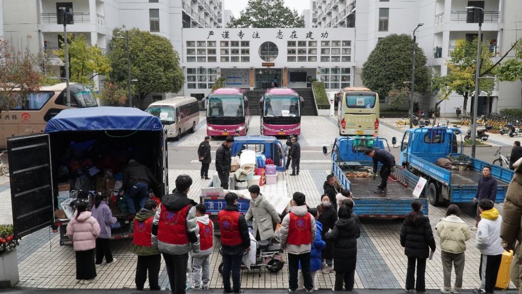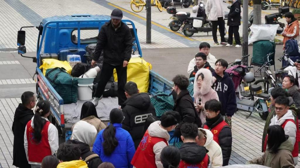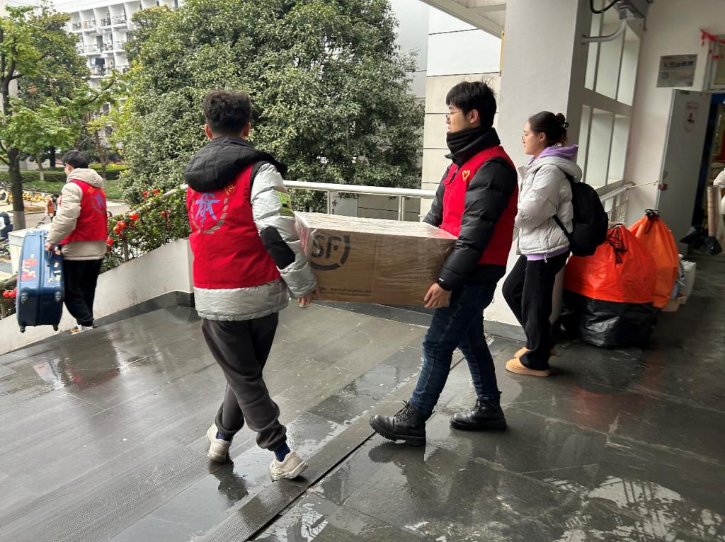 与此同时,团委学生会迅速响应,组建志愿者服务团队,在宿舍楼下搭建起温暖的服务点。志愿者们,助力搬运行李;指引清晰路线;洋溢着温情与便利。